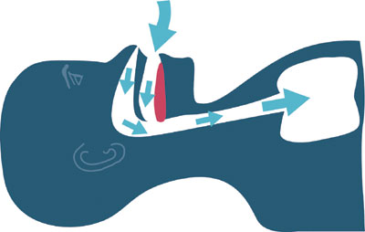 • Eine rückwärtige Unterkieferposition verursacht das Zurückfallen der Zunge (rot) in den Rachenraum und somit eine Verengung oder sogar den Verschluss der Atemwege.